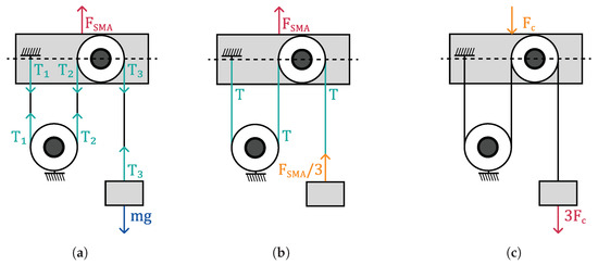 The increase in displacement resulting from the hoist system leads to changes in the pulling and recovery forces. The arrangement of the fixed and mobile pulleys determines the forces and tensions in the hoist system. Figure 3a presents the involved forces; assuming that the pulleys have no mass or moment of inertia due to their relative weight compared with the rest of the system, the tensions in the system are equal along the entire string . The relationship between the force generated by the SMA wires at the mobile axis, , and the resulting force in the payload, T, is called the mechanical advance (MA). Equation (2) determines the MA produced in a system with the contraction of an SMA.