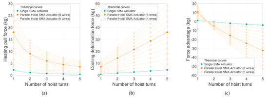 Payload capacity in different parallel configurations for a given SMA wire. (a) Decrease in the pulling force. (b) Increase in the deformation force. (c) Force augmentation.