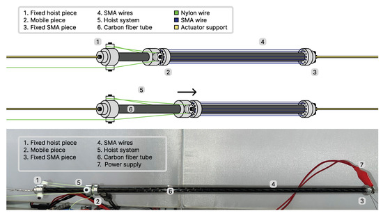The main assembly consisted of three aluminum pieces: two fixed and one mobile. The mobile piece connected the SMA wire to the hoist and served as a power supply connector; it was displaced by the wire contraction when heated. One of the fixed pieces kept the SMA wires stretched and served as a power supply connector, whereas the other one held the fixed pulleys in place to enable the hoist system to function. Both pieces also supported the actuator during the tests. The system was supported by a carbon fiber tube, which had a low friction coefficient and improved the control. The design of the proposed actuator was intended to minimize the weight while maximizing the payload capacity. To achieve this, lightweight materials, such as aluminum, were used for the metallic components, and a hollow carbon fiber tube was used for support.