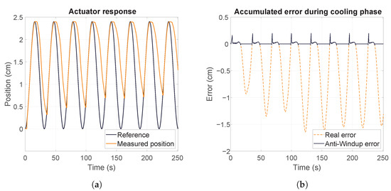 Despite the challenges presented by the cooling state, the actuator achieved the maximum displacement in each cycle. During the cooling phase, the real error was large because the wire could not be forced to cool down, as shown in Figure 8b. The anti-windup block from the NASS controller eliminated the accumulated error, allowing the response at the beginning of each cycle to remain within the stability limits. As a result, the SMA reached the reference with an underdamped response, and the heating delays that negatively impacted the actuator’s response were substantially reduced.
