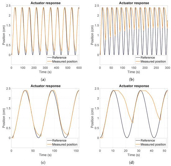 The controller parameters, which are detailed in Table 1, were adjusted by observing the actuator’s response to the reference signal. The position was measured in sensor units, with a conversion rate of μm. The reference, position, and error are expressed as , but, for clarity, they are shown in centimeters. Therefore, the PID gains are expressed as .