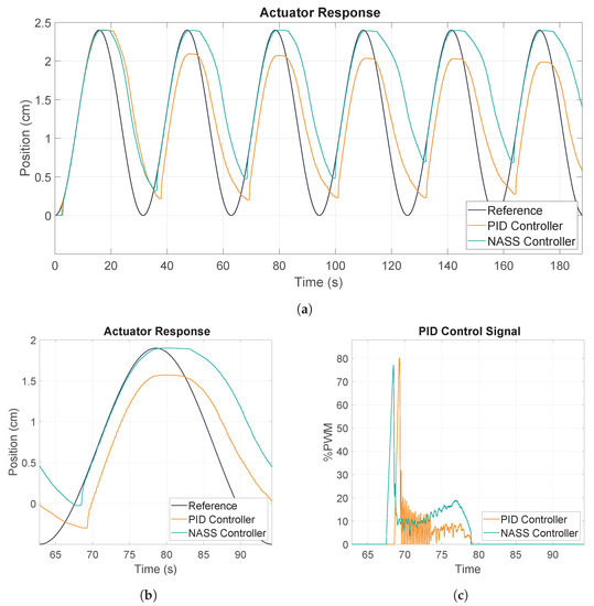 A closer examination of the signal while focusing on a single cycle, as depicted in Figure 11b, revealed another notable difference in the generated position. The PID signal exhibited a stepped behavior, which was typical of on–off control, whereas the NASS controller produced a smooth movement that closely followed the reference. This was further supported by the control signals shown in Figure 11c. The NASS control signal remained slightly higher and smoother, which increased power consumption, but was beneficial for the actuator’s response and lifespan. The PID signal extensively oscillated between zero and higher values, introducing noise into the system and producing an oscillatory behavior.