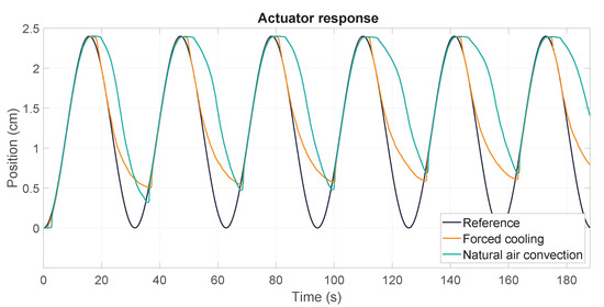 To enhance the performance of the actuator and examine the effect of environmental temperature on recovery, an additional test was conducted while using a power supply fan to cool the SMA. This fan was positioned below the actuator and maintained a constant air flow during both the heating and cooling cycles to force the ventilation of the wires. The results are displayed in Figure 12, in which the actuator’s response is compared with that achieved with natural and forced air convection. The results revealed that the environment negatively impacted the performance of the SMA wires by absorbing heat from them. This resulted in a delayed response and a less efficient cooling curve during the initial stages of the cooling phase. However, when the environment was refrigerated by using a fan, the SMA wires were able to start the cooling phase without any interference from the environment.