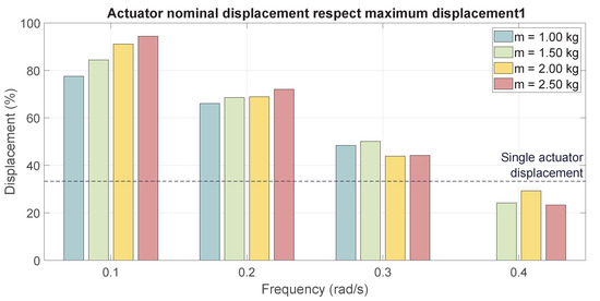 After calculating the nominal displacement produced for this design, we could compare the obtained results with those of a single SMA-based actuator. The hoist system detailed in Section 2.2 provided an increase in the maximum displacement; for this configuration, where , the maximum displacement was, therefore, multiplied by three. In Figure 13, the nominal displacement accomplished for each payload and frequency is presented and compared with the theoretical maximum displacement of a single SMA-based actuator without the high-displacement hoist system approach.