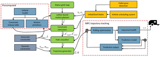 Navigation system framework. The variables and indicate the starting pose and target pose of the vehicle, respectively; indicates the maximum steering angle; L indicates the distance between the front and rear axles of the forklift truck, and , respectively, as constraints on velocity and acceleration in the forward direction. The and denote two collection of points in the state space and the control space, respectively, is the angle constraint, and is the inner constraint. A pre-computed constraint lookup table was used to extract a set of position and angle inequality constraints for the vehicle model.