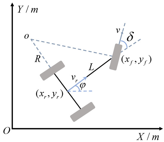 Because of the low speed of forklifts in logistics transportation, the lateral forces of forklifts are low. Assuming that the forklift would not skid during operation, we only needed to establish the forklift kinematic model to complete the trajectory planner design. Assuming that the forklift body was rigid and the deformation of wheels could be ignored, the forklift motion would not pitch or roll on the plane, and the contact point between the wheels and the ground would only produce rolling contact without sliding. The kinematic model of the forklift is shown in Figure 3.