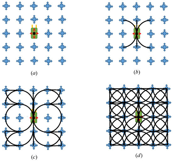 In our thesis, we construct a 4D state lattice based on the position (x, y), heading (), curvature (k) for the kinematics model of the forklift. In order to simplify the construction process, we use a special discretization of state and control space [28]. The orientation of the forklift is assumed to be uniformly distributed in space [0, 2], and the discrete curvature K is also uniformly distributed between [, ], where . Figure 4 shows the accessible graph for the forklifts with three actions. Due to the random position of the forklifts in autonomous navigation space, the state lattice is required to have spatial repeatability, motion primitives generated at a certain node can be applied to other nodes too. The motion primitives in Figure 4 are generated by copying motion primitives from the starting point to other nodes, so the global paths generated by the control system are also feasible for the forklift. Through the generation of motion primitives in the state lattice, the global path planning problem is transformed into the path search and decision problem in different motion primitives, and then generate the feasible trajectory. Combined with the commonly used ARA* search algorithm, we can then obtain a path from the start point to the target that satisfies the kinematic constraints for the forklifts.