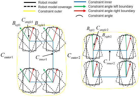 The pre-calculation module employed in this paper generated different robot envelopes according to different forklift models and corresponding load models, and also calculated a pre-set internal position constraint and angle constraint that were stored in the table. The size of the inner constraint in the safety envelope constraint set was the rectangle formed by the linear combination of the displacement of the forklift reference point in four directions; forward, backward, left, right, in addition to angle. The angle constraint was the linear combination of the left and right offsets based on the direction of the forklift reference point. We arranged and combined the internal constraints and the angle constraints freely and, then, calculated the area and angle constraints of each set of internal constraints . We used their product as the weight w of each constraint set and stored them in the security envelope constraint set , in order of weight. Finally, according to the differences of the forklift envelopes, the outer constraints generated by each pair of constraints were calculated. As shown in Figure 6, the two graphs display the combination of the two kinds of internal constraints (blue rectangle) and angle constraints (red arrow and green arrow) in the lookup table, which generated a schematic diagram of the outer constraint (yellow polygon). The algorithm flow is shown in Algorithm 1.