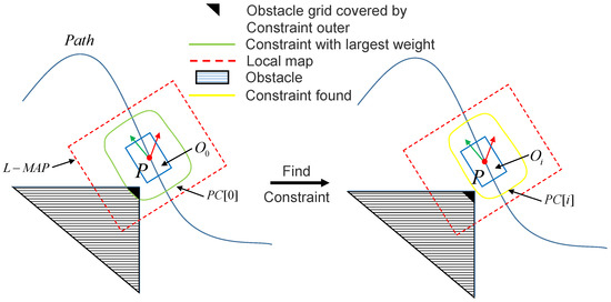 The above constraints defined all possible sets of safety envelopes for each waypoint in the original path of the vehicle, without considering obstacles. Next, we introduced the solution of the maximum safe envelope for each waypoint, considering obstacles. For each waypoint, our constraint generation algorithm generated a local map at the point, which saved the largest external constraint and set the grid covered by the local map in to and saved these in array . If we relocated the local map to each waypoint P and if covered the obstacle grid on the world map, it would continue to traverse the next element in the security envelope constraint set according to the weight w. We followed this method until the of the first uncovered obstacle corresponding to in the safety envelope constraint set was found, that is, the outer constraint of this waypoint, which is shown in the following figure. Conversely, the maximum external constraint was the constraint of the path point P. The algorithm block diagram of the waypoint-finding constraints is shown in Figure 7. The triangle area is the obstacle, the black area is the part covered by the external constraints of the robot, the red dotted line is the local map, the green line represents the largest external constraints in the PC, and the yellow line is the found external constraints. The safety envelope of the entire feasible path was obtained by superimposing the external constraints of all path points. The secure envelope of the path is shown in Figure 8. The algorithm flow is shown in Algorithm 2.