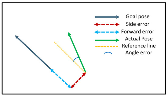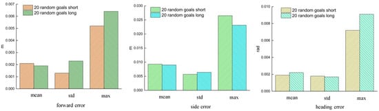 For a non-holonomic vehicle, it was difficult to control the direction and the position perpendicular to the motion direction, which was convenient for analyzing the data. We decomposed the errors into forward errors, lateral errors, and heading errors, as shown in Figure 10. For each type of error, we showed the results in terms of mean, standard deviation, and maximum value obtained during the test operation.