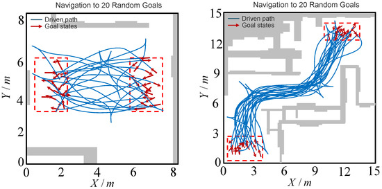 To further test the robustness of our system for arbitrary target poses and longer distances, we used two test scenes, as shown in Figure 11, each with two blocks marked by dashed lines area. A total of 20 target groups were randomly generated between two areas. The vehicle was tested in two scenarios, from one area to another, reciprocating between multiple poses, and a total of 40 paths were tested.