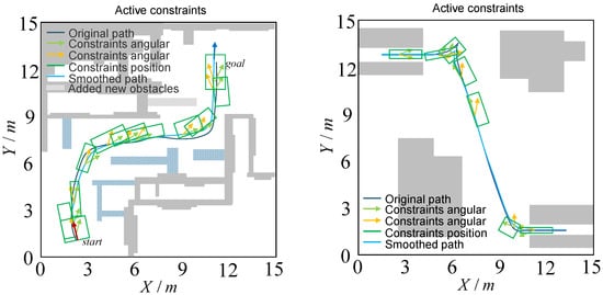 In order to test the operation of our method in more challenging scenarios, we conducted experimental evaluations in narrower and longer scenarios with additional obstacles, as shown in Figure 13. In the figure, the shaded part is the additional obstacle, as expected, due to the more complex space of these two test scenes; the deviation of the smoothed path from the original path is smaller, and the number of space constraints is higher. The experimental results showed that the planning method proposed in this paper was also effective in more challenging scenarios.