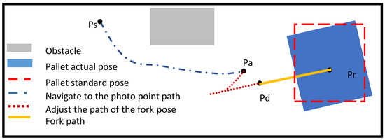 Therefore, current unmanned forklifts all operate on pre-designed fixed routes. When they arrive at the handling point, they usually employ the “blind fork” method to complete their task. If these forklifts deviate from the fixed routing, these forklifts are unable to fulfill their mission. Furthermore, they have also occasionally caused serious accidents [3]. In this off-line path generation method, even if the deviation of the final posture can be detected by the sensor, it is challenging for the vehicle controller to correct the deviation within a relatively short distance. Therefore, it is difficult for current unmanned forklifts to meet the handling requirements of flexible production required at an industrial scale, which significantly limits the application of unmanned forklifts in intelligent digital factories.