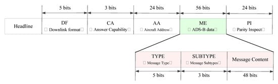 The ADS-B message content is 112 bits in total and is divided into five parts comprising: ① a 5-bit downlink format (DF); ② a 3-bit answer capability (CA); ③ a 24-bit aircraft address (AA); ④ a 24-bit parity check (PI); and ⑤ 56-bit ADS-B data (ME). [18] The specific allocation amounts and functions are shown in Figure 2. The 56-bit ADS-B data are subdivided into a 5-bit message type (TYPE) field, a 3-bit message subtype (SUBTYPE) field, and a 48-bit message content. The message content is an important carrier of aircraft flight status parameters and ground target information parameters, carrying the position information, altitude information, and aircraft airspeed information of air or ground targets. In this paper, based on the UAV position information in the ME field, the flight path of the UAV is predicted.