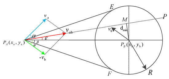 From the expression, it can be seen that the magnitude of depends on the magnitude of the values of , and the angle between the two and the axis. According to Equations (18) and (21), it can be seen that when the relative speed where ray crosses the safety range area of the intruder, if UAV continues to fly according to the current speed magnitude and direction, there will be a flight conflict with the intruder, when . When , then there will be no flight conflict between the UAV and the intruder.