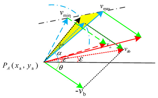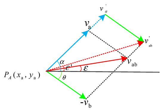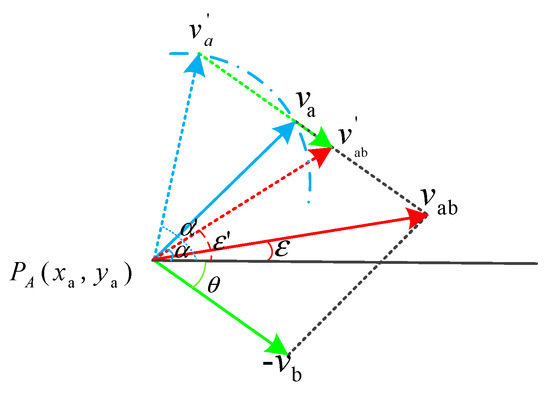 The blue dashed line in the figure indicates the velocity of the UAV after changing the numerical size of the velocity , whose angle with the axis positive is still , and the red dashed line indicates the relative velocity of the two , whose angle with the axis positive has a size of . In the velocity-adjusted vector triangle, by the sine theorem it is obtained that: