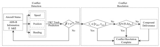 The flow of the UAV flight decoupling strategy is shown in Figure 7. First, based on the information provided by the ADS-B information, the UKF is used to perform the trajectory prediction, and by judging the size relationship between and , it is predicted whether a flight conflict will occur between the UAV and the intruder in the future flight process. If there is a potential flight conflict, the corresponding way of conflict resolution needs to be selected according to the conflict resolution strategy. It is determined whether the speed change amount can meet the resolution requirement and speed constraint; if not, it is judged whether the resolution requirement and heading constraint are met through the heading angle change amount. If both of these ways cannot achieve the purpose, the compound resolution is used.