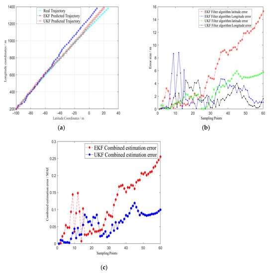 Figure 8 contains three graphs, identified as (a), (b), and (c). In Figure 8a, the prediction trajectory plot of UKF and EKF is presented, and it can be observed that the prediction effect of UKF is better than that of EKF, with a better fit to the true value. Figure 8b displays the magnitude of the prediction errors of the longitude and latitude coordinates of UKF and EKF. The figure shows that the magnitude of the prediction errors of the longitude and latitude of UKF is relatively stable, while the stability of the prediction errors of the longitude and latitude of EKF is not as good as that of UKF. In Figure 8c, the prediction comprehensive error is shown, and it can be seen that the overall performance of UKF’s prediction comprehensive error is superior to EKF. The simulation data of the three charts are summarized in Table 1. The latitude error, longitude error, and comprehensive error of UKF are 46%, 72%, and 50% of EKF, respectively.