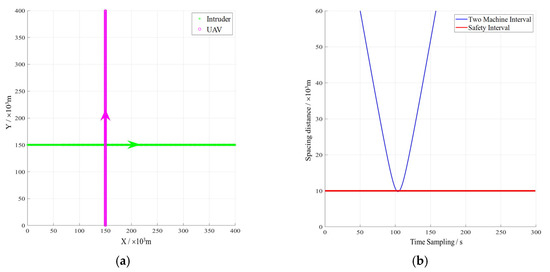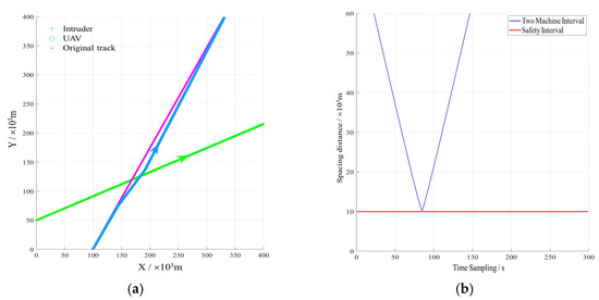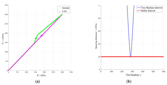The initial coordinate of the UAV is and the heading angle is , the initial position of the intruder is , and the heading angle is . The simulation results are shown in Figure 12; the interval between the UAV and the intruder at is at the safety critical value. at this time, the UAV chooses to accelerate and turn to avoid the intruder at the same time. The change of speed is and the change of heading angle is , which meets the requirements of speed and heading change. According to the interval between the two aircrafts, it is known that the compound release can ensure that the interval between the two aircrafts is above the safe interval and achieve the purpose of conflict resolution.