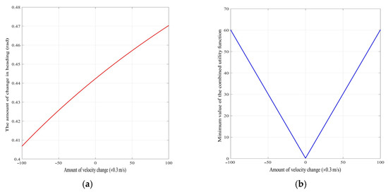 The relationship between the amount of speed change and the amount of heading change, and the integrated utility function: (a) the amount of speed change and heading change; (b) amount of velocity change and integrated utility function.