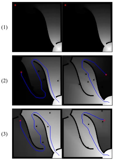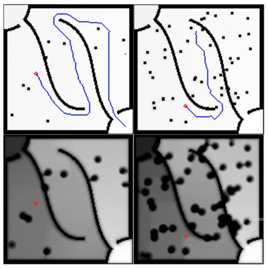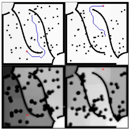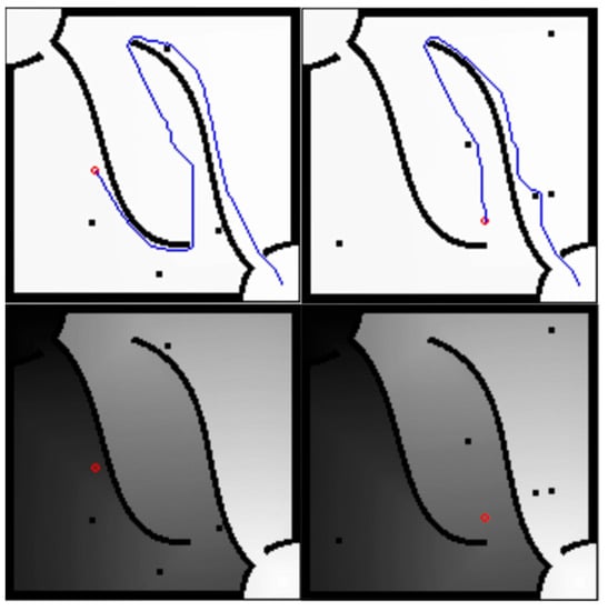 Now we use (15) to iterate, but remove the z(s) part, and Equation (14) is modified to c(o, s) = 0, which means that only the value function of the obstacle itself is 0, and there is no additional protection. The number of obstacles is five. The results are shown in Figure 3. Figure 3 shows the real-time path planning. In the figure, the top row is the live path and the bottom row is the value function image. All the states updated by Equation (15) in the value function image are bounded in [0, 1], the value of walls and obstacles are fixed in 0 and the goal is fixed in 1. According to the update rule, the goal is the only one with highest value; hence, the path toward to the highest value, which is only the goal, can be easily found. The agent can follow the path to reach the target point and avoid obstacles in time, but we can see that the agent does not keep a certain distance from walls and obstacles, and so has a high probability of hitting walls and obstacles in reality.