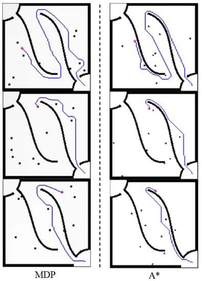 The simulations of the proposed MDP path planning algorithm with different number of obstacles will be shown in Figure 7 and Figure 8 and compared with the A* algorithm path planning. It can be seen that in the two figures, the A* path planning algorithm must ensure that all paths are passable before the end point can be planned. However, the MDP method used in this study does not necessarily have to search for the end point to generate a path. Like the part of the MDP in Figure 8, the path is not generated to the end and can be moved immediately because when using the MDP method to replace the value function with the starting point, the agent basically already knows the dynamics of the entire environment. It is therefore not necessary to follow the value function to give a new path trend, as it will be correct, and it does not have to be updated to the end. However, this is not the case with the A* algorithm. The agent of the A* algorithm does not understand the dynamics of the entire environment every time it recalculates, so it must find the end point when calculating the path. This also causes the agent to stay in place once there is no way to find the path to the end point. This way, the agent will be hit directly by the moving obstacle. However, the method in this paper will reduce the value function because the grids around the moving obstacles will cause the planned path to actively avoid these moving obstacles. This is also one of the advantages of this method.