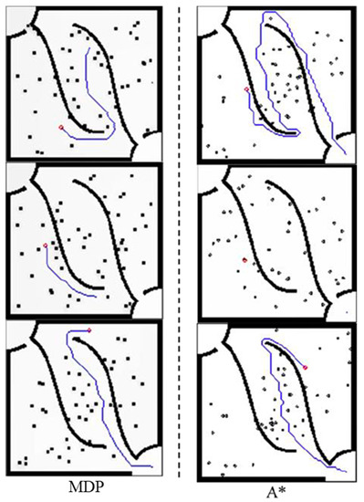 Comparison of MDP and A* path planning in the case of 10 obstacles.