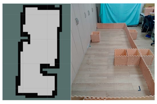 This section reports the experiments conducted on mobile robots in practical applications. The experiments are divided into test items such as no obstacles, fixed but unknown obstacles, moving unknown obstacles, and people walking constantly, and they are compared with the A* algorithm. This path planning experiment uses ROS, so the navigation package in ROS must be rewritten. The one to be rewritten is nav_core::BaseGlobalPlanner in ROS. After ROS gets the path, it will use the built-in path tracking algorithm to move. Figure 10 is the map of this experiment, and the left side of the picture is the result of SLAM on the actual field on the right side. The starting point is in the lower right corner of the picture, and the target point is in the upper left corner of the picture. On the left is the picture from SLAM. The size of the map is about 3 × 1.8 m, the resolution is 0.1 m/pixel, and then the pixels are used as the discretized grid map. After the output path is sent to ROS, the system will automatically adjust the path to make it smoother. Among them, the parameters are given as kz = −3 × 10–3, kd = −0.1, α = 1, dmax = 3 and r2max = 3.