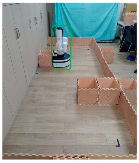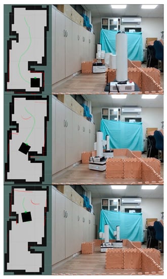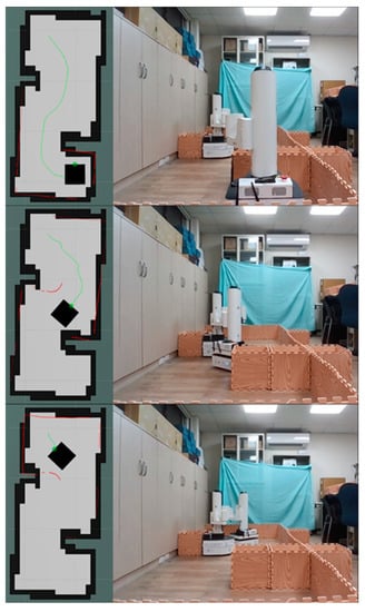 In the second experiment, the unknown fixed obstacles are shown in Figure 12, and the test with unknown but fixed obstacles is shown in Figure 13. In the third experiment, a test with unknown moving obstacles is carried out. The unknown moving obstacles are the same as those shown in Figure 12 and are moved. Figure 14 and Figure 15, respectively, show the Markov decision process path planning algorithm and the A* algorithm. This mobile obstacle is another mobile robot, which moves in the environment and is operated artificially. In this experiment, it was found that the A* algorithm experienced some delay, but it should be within the error range.