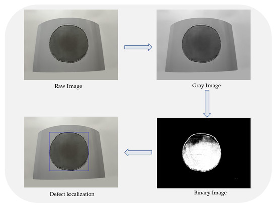 In the methods for 3D defect localization, most of them adopt the direct point cloud-based method. However, compared to the method based on the combination of 2D and 3D, the direct point cloud calculation is more complex and time-consuming. To more quickly and accurately locate the defect position, we first precisely locate the defect position in the 2D image using grayscale image processing. The purpose of applying grayscale to images is to smooth rough edges and reduce noise, and one of the fastest methods in image segmentation is image thresholding. The grayscale image is used as the input image, and the threshold is set based on the gray value difference between the defect area and other areas in the grayscale image. A binary image is then generated, and erosion and dilation morphological operators are used to separate the weld boundary and locate the defect area. The process is depicted in