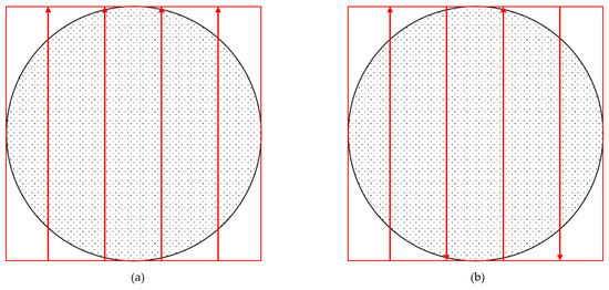 Figure 21a,b show the parallel grinding trajectory in one direction and the grinding trajectory switching back and forth, respectively. It can be observed that the time required for parallel sanding in and out in one direction is much longer than the time required for parallel sanding in and out switching back and forth. The spiral sanding based on the curved surface only requires one tool in and out and continuous sanding without any pause. The sanding speed was set at 50 mm/s, 70 mm/s, 90 mm/s, and 110 mm/s, respectively, and the time taken to sand the entire defect area for each of the three sanding methods is shown in the