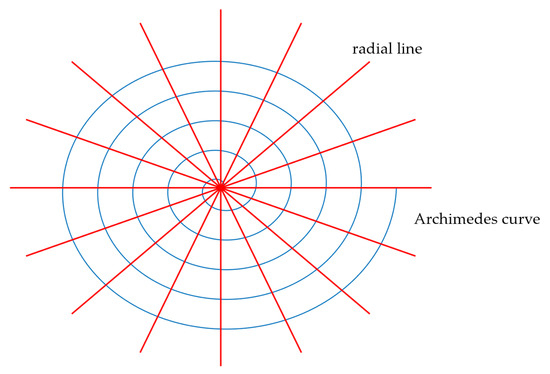 The intersection of a radial line and the Archimedes curve is a plane path point, and the distance between adjacent intersection points of the same radial line and the spiral line is equal. On a plane, as shown in the left figure of