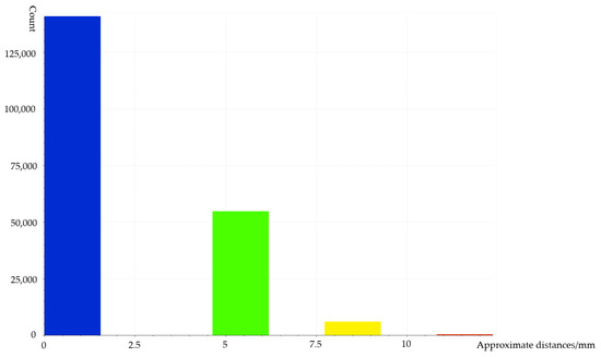 The x-axis represents the distance from the point to the surface in millimeters and the y-axis shows the number of point clouds. Most of the point clouds are between 0 and 2.5 mm, which correspond to points on the surface, and the maximum weld reinforcement is 15 mm. The number of times the welding seam must be ground is determined based on the highest weld reinforcement until the height of the welding seam is equal to the surrounding height.