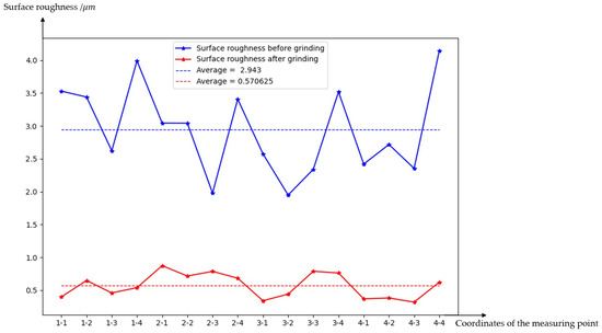 Figure 28. We measured 16 groups of roughness data on the surface of the workpiece after grinding, where 15 groups of roughness were below 0.8 microns and one group was 0.87 microns, meeting the requirements of aerospace grinding technology. Prior to grinding, the roughness of each point was larger with a wider range of variation, and the average value was 2.943. After grinding, the roughness of each point was significantly reduced, and the differences between the roughness values for each point were small, with an average value of 0.57. The average roughness value decreased by 80.63%, indicating the effectiveness of the spiral grinding method for grinding large aluminum alloy surfaces.