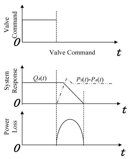 Digital hydraulic systems, which apply a number of fast-switching valves switching at high frequencies [1,2,3,4,5,6], show higher theoretical efficiency and better controllability than traditional servo/proportional ones. In principle, applying fast switching valves in digital hydraulic systems could efficiently avoid energy consumptions that go over the valves. However, the response time of physical valves can only achieve between 1–2 ms; during a switching-off process, a certain switching power loss will be generated, since a pressure difference and flowrate exist before the valve is completely switched off. Moreover, when the valve is suddenly switched off, the fluid with a large kinetic energy will generate large pressure pulses, which lead to vibrations and noises and make the system less efficient and accurate [7].