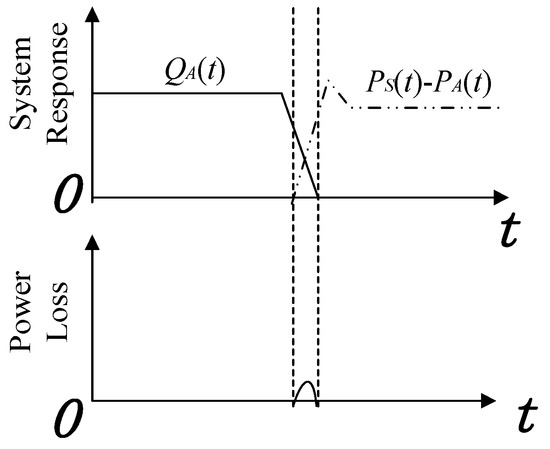 where T is the time period of the pressure waves; N = 0, 1, 2, 3…; as presented in Figure 3, at the beginning of the switching-off process, PS(t) − PA(t) is small but the value of QA(t) is close to required flowrate; at the end of the switching-off process, PS(t) − PA(t) is equal to PS(t), which is a large value, while Q(t) is small. A certain level of power loss is observed during this process.