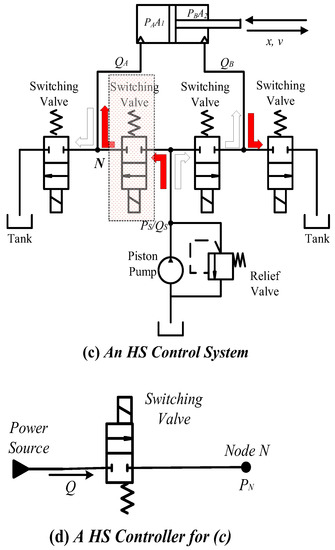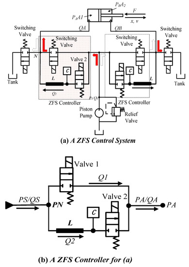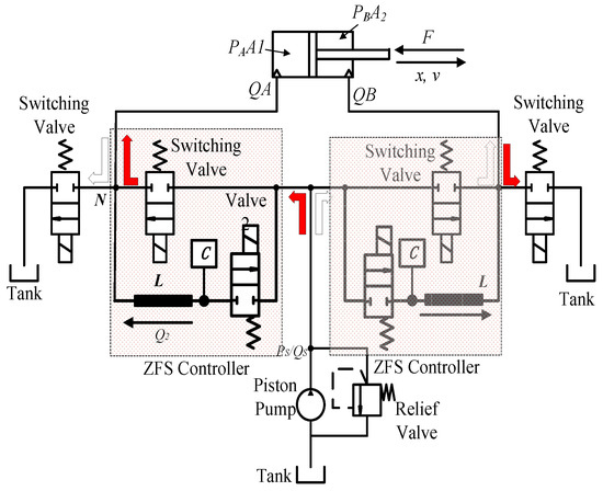 In this paper, the ZFS control method is proposed to actively reduce switching power loss and restrain the pressure pulses for a typical four-port switching system—shown in Figure 1—to achieve a more efficient and smoother performance. The four-port switching hydraulic system controlled by the ZFS controllers is shown in Figure 5. The groups covered by red sheets are two ZFS controllers: one is to regulate extension motion and the other is for the drawing back of the cylinder. A ZFS controller includes a main control valve and a resonant line; the resonant line consists of a switching valve, a hydraulic inductance and a hydraulic capacitance.