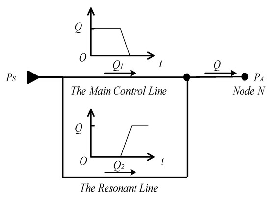 where PS0 is the average value of the supplied pressure; PSa is the amplitude of the pressure waves and ω is the angular speed of the pressure waves. The term is used to generate the sinusoidal resonant flowrate Qres. When the RLC resonator works, the pressure waves distributed along the line are represented as
