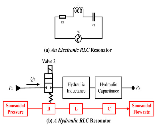 In a hydraulic counterpart, the resonant line is composed of a fast-switching valve, hydraulic inductance and hydraulic capacitance (shown in Figure 7). The power supplier is a regular piston pump which outputs constant pressure with tiny amplitude waves.