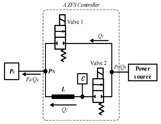 The ZFS control method is to regulate the flowrate of the switching valve to zero right before the valve switches off. Figure 6 presents a hydraulic schematic of a ZFS controller. It consists of a main control line and a resonant line. The main control line is to supply the pressure and flowrate for the load. When it is about to close the main control line, it opens the resonant line, and then the flowrate of the resonant line starts to increase. Accordingly, the flowrate of the main control line falls down until it is zero. Then, the main control line is closed. This is the principle of a ZFS controller.