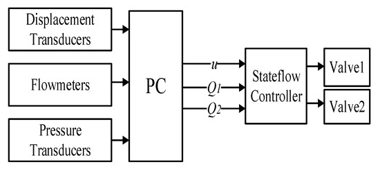 Figure 9 shows the schematic of the electronic controller for a ZFS control system. Position of the cylinder piston, flowrate of hydraulic lines, and system pressures are collected by the transducers and sent to a PC. When it is ready to switch off the control line, the PC sends a command to a stateflow controller. At the same time, the flowrate of Q1 and Q2 are also sent to the stateflow controller.