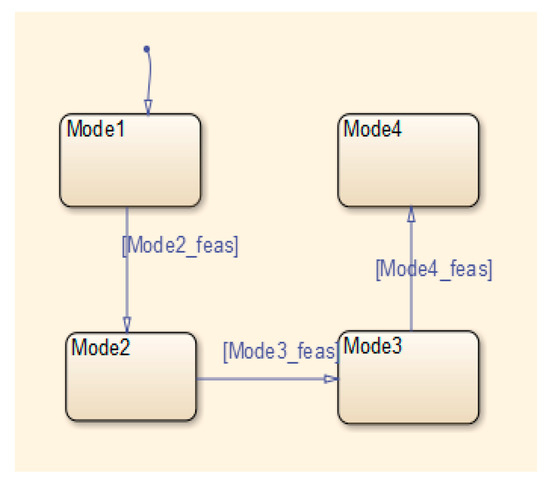 The stateflow chart (shown in Figure 10) determines the running mode of the system. When the stateflow controller receives command u from the PC, the system automatically runs in mode 1; when u = 1 is true, the controller is switched to mode 2; when Q1 = 0 is true, the controller is switched from mode 2 to mode 3; when Q2 = 0 is true, the controller is switched to mode 4. The conditions are defined as: