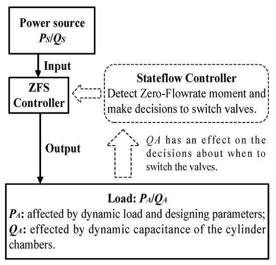 Figure 11 shows the relationship between the performance of a ZFS controller and some parameters of the system. The power source provides PS/QS as an input of the ZFS controller. Most piston pumps are feasible options to pressurize the system with proper pressure waves due to the reciprocating movement of the pistons. The output of the ZFS controller is defined by system parameters: the PA is required by the velocity and dimensions of the cylinder, as well as the exerted load force on the cylinder rod. The QA basically adapts the velocity of the cylinder. The capacitance of the cylinder would also have an effect on the QA, since a large derivation of the load force creates a certain flowrate within a fixed volume (the cylinder chamber can be regarded as a fixed volume when the time derivation is very small). A stateflow controller is employed to detect zero-flowrate moments and make decisions about when to switch the valves.