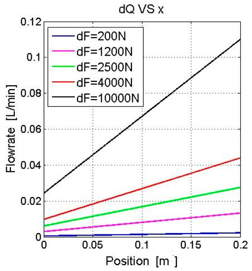 When the piston of the cylinder is moving, the volume of the cylinder chamber is varied; the varied chamber shows capacitance when the load force is changing. Such dynamic capacitance leads to flowrate change. According to Equation (12), the pipe volume and piston area have an effect on the flowrate change. Figure 13 presents a linear relationship between the position of piston x and the derivation of flowrate dQ. The piston area is 0.002 m2, the diameter of the pipe of 0.012 m and the length of the pipe is 1 m. As the position of piston x increases from 0 m to 0.2 m, the derivation of flowrate dQ linearly increases correspondingly. When dF is 200 N, the derivation of flowrate dQ is relatively small and the slope of the curve is small; as dF increases, both dQ and the slope of the curve respond to this increase.