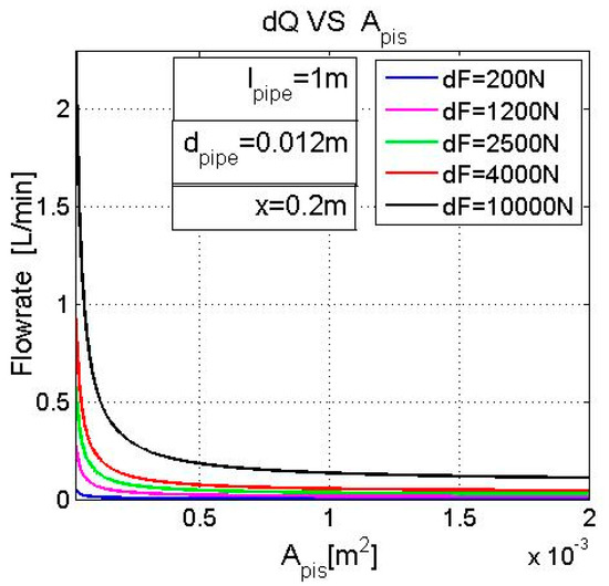 When the area of the piston is Apis fixed, the derivation of flowrate dQ changes as the derivation of force dF increases. Take Apis = 5 m2, for example; the derivations of the flowrates are dQ = 0.0038 L/min when dF = 200 N, 0.023 L/min for when dF = 1200 N, 0.053 L/min when dF = 2500 N, 0.073 L/min when dF = 4000 N and 0.2 L/min when dF = 10,000 N.
