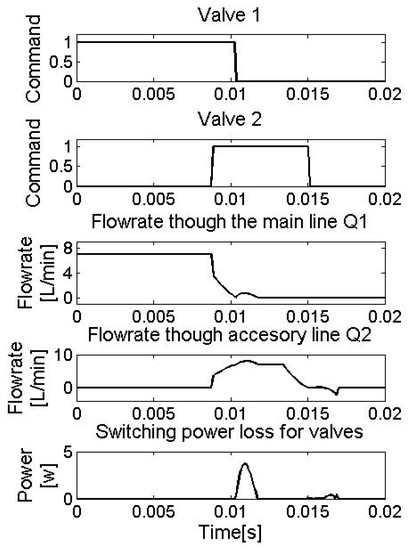 Theoretically, the fast-switching valve works only in ON and OFF states; the switching power loss is supposed to be zero. However, physical switching valves are not ideal ones. It is assumed that the flowrate-to-time is linear for the valve opening of valve 1 and valve 2, thus the orifice coefficient of the valve opening is