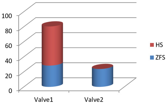 Moreover, the system with a dynamic ZFS controller leads to minor pressure pulses. One switch in a normal HS controller excites pressure pulses with a peak value of 1.1 × 106 Pa, while the peaks of the pressure pulse are 1.1 × 104 Pa and 2.3 × 105 Pa for valve 1 and valve 2, respectively. Pressure pulses in a dynamic ZFS system are much minor than those in a HS system.