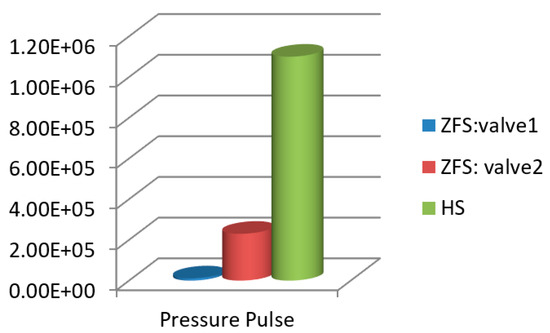 As shown in Figure 19 and Table 4, one switch in a normal HS controller excites pressure pulses with a peak value of 1.1 × 106 Pa, while the peaks of the pressure pulse are 1.1 × 104 Pa and 2.3 × 105 Pa for valve 1 and valve 2, respectively. Pressure pulses in a ZFS system are much minor than those in a HS system.