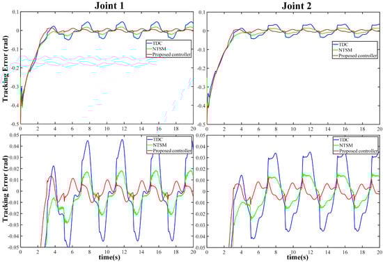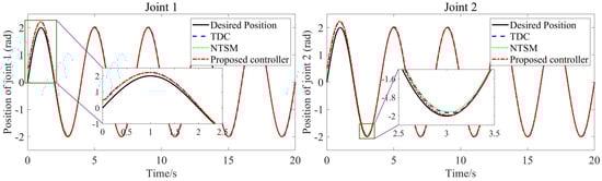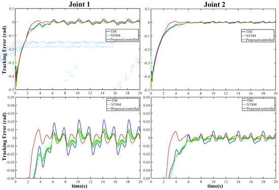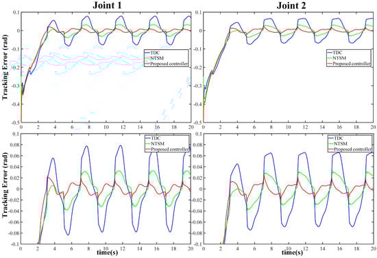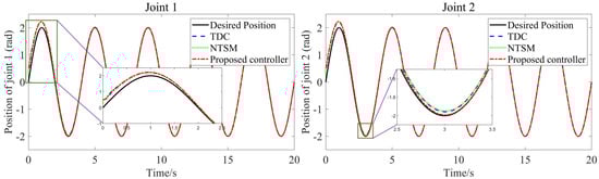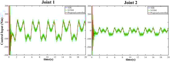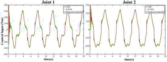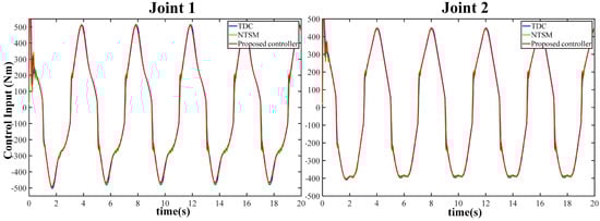 This section compares the simulation results of three algorithms at , , , and , as presented in Figure 2, Figure 3, Figure 4 and Figure 5. The FCC achieves maximum tracking errors of approximately rad and rad for joint 1 and joint 2, respectively. Compared to the TDC algorithm with linear error dynamics, the FCC exhibits smaller tracking errors. Furthermore, Figure 4 demonstrates that there is no jitter in the control inputs of the two joints.