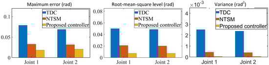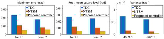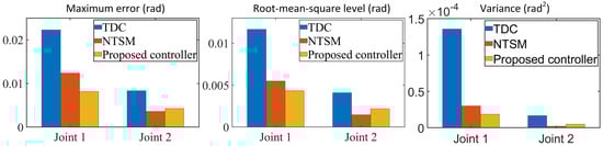 The tracking trajectories and tracking errors of the three controllers are presented in Figure 10 and Figure 11. Figure 12 illustrates the control input voltage of the three controllers, indicating that their input voltage remains smooth and constrained. Figure 13 summarizes the performance indicators for the last three cycles, with TDC demonstrating the worst tracking performance due to its low robustness to nonlinear friction disturbance. In contrast, the FCC delivers the best performance in all performance indicators. Specifically, according to the variance shown in Figure 9, the addition of AFLS improves TDC performance by 97.885% and 97.712% for joint 1 and joint 2, respectively. The numerical experimental results reveal that, compared with the other two controllers, the proposed FCC delivers the best tracking performance in both transient and steady-state aspects.